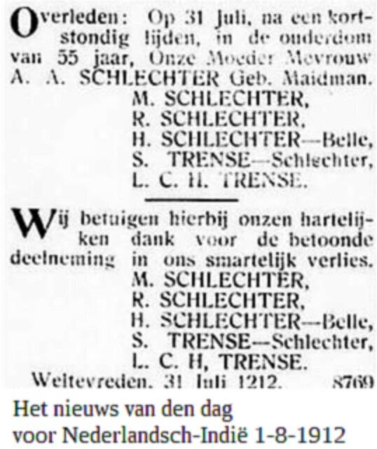 Van juni 1898 tot juni 1901 verbleven zij in Europa, waarna Heinrich Jacob Schlechter opnieuw tekende om voor zes jaar in Nederlandsch-Indië te dienen. Rond het einde van zijn diensttijd,1907 verliet hij zijn gezin.