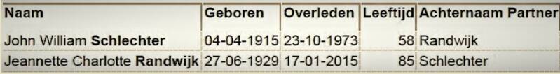 Jeanette Charlotte Schlechter geboren Randwijk is overleden op 17 januari 2015 in het verpleeg tehuis St. Antonio te Terborg, Industrieweg 115 en is opgebaard te Ulft - Monuta uitvaartcentrum; nijverheidsweg 4.