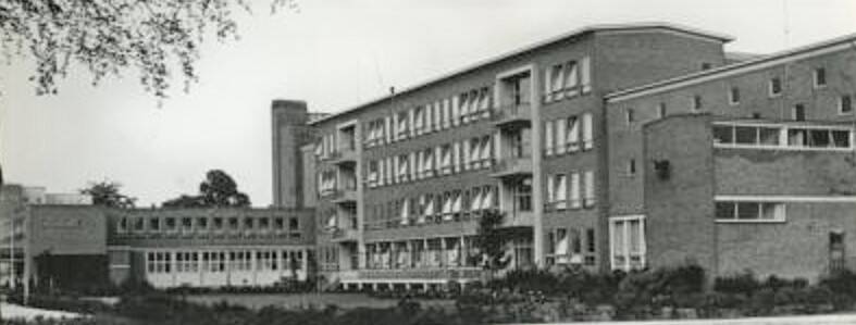 1970.^ Ingang ziekenhuis, Doctor Huber Noodtstraat, sniplaan 1. Foto rechts: 1970.Achterkant van het ziekenhuis. RK kapel