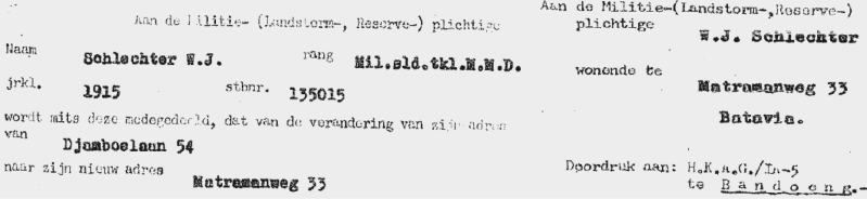 Woon adres: Secretarie weg 8, Tjideng West 74 Batavia.