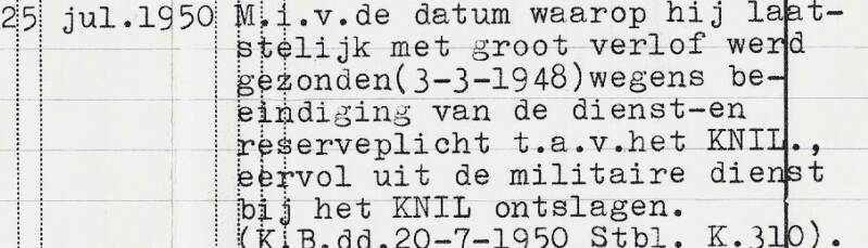 T.a.v. het KNIL eervol uit de militaire dienst bij het KNIL ontslagen. KB.20-07-1950 Stbl. K31.