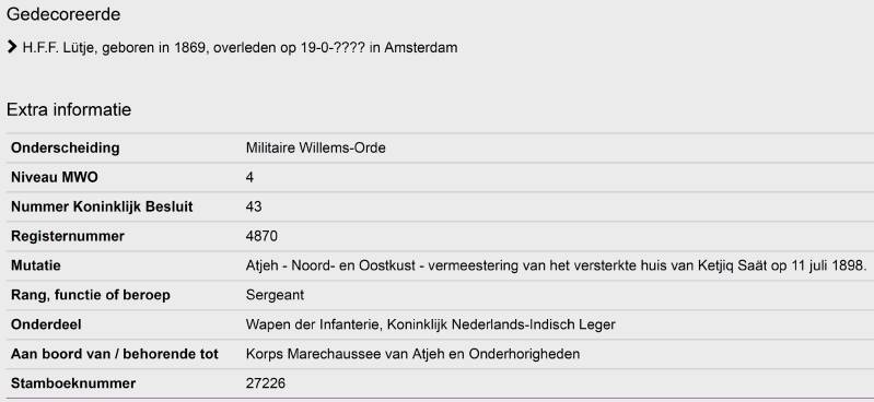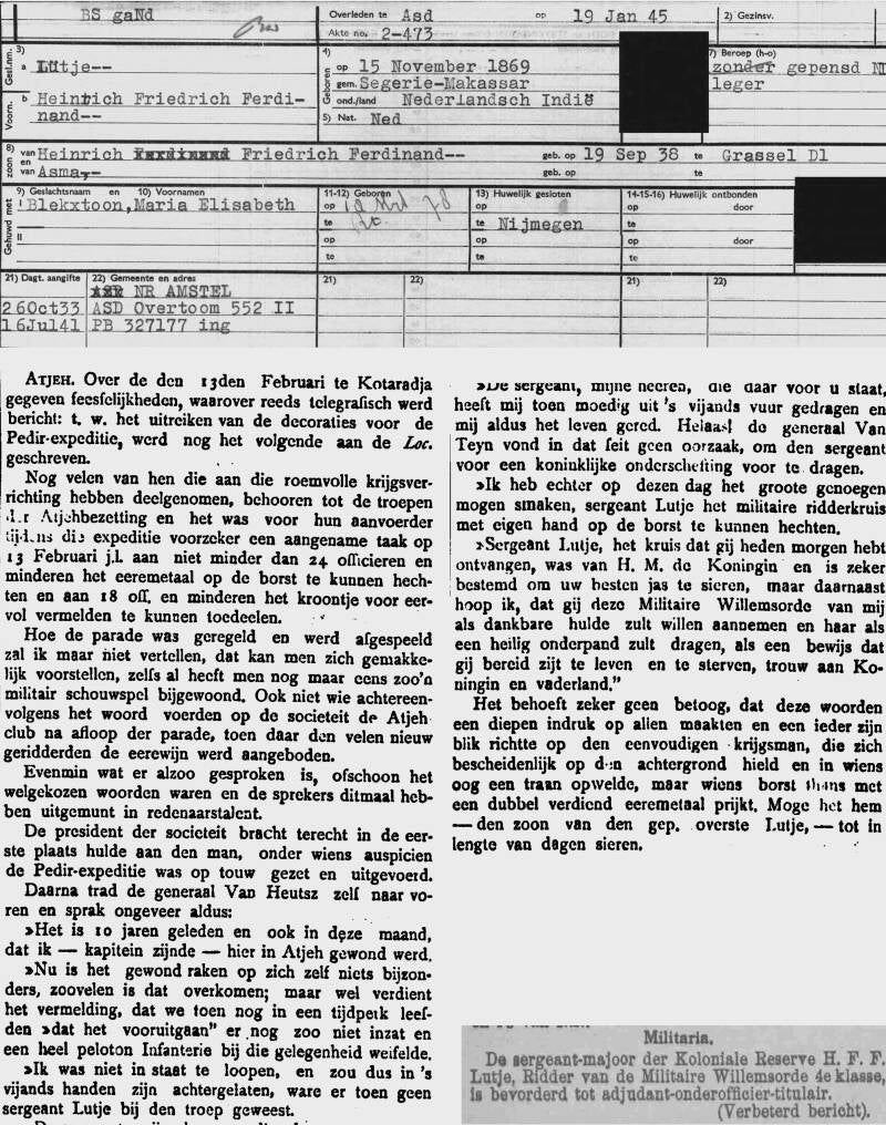 Heinrich Friedrich Ferdinand Lütje, Wettelijk erkend; sergeant majoor, Ridder M.O. 4de klasse, geboren 7 maart 1870 te Segeri Makassar. Huwelijk op 18 aug 1890 te Amersfoort met Cornelia Helena Joustra en zij overleed op 18 okt 1890, 2 maanden na huwelijk en hij huwde 2e op 28 dec 1911 te Amsterdam met Maria Elisabeth Blekxtoon en gescheiden te Nijmegen op 1 okt 1919. Heinrich overleed op 19 jan 1945 te Amsterdam.